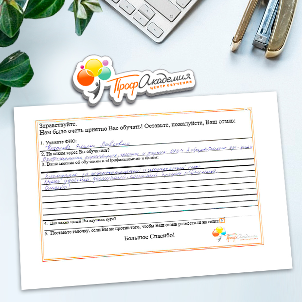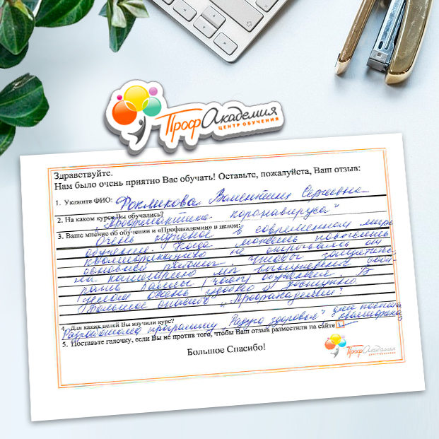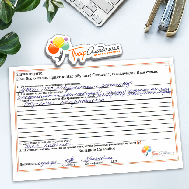 Очень замечательная организация. Все очень понравилось. Со специалистом Еленой очень было приятно работать. Она все хорошо объяснила, быстро прислала все документы. Специалист своего дела. В дальнейшем буду обращаться в "Профакадемию" Оценка 5+